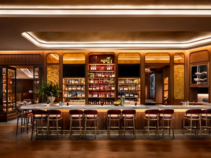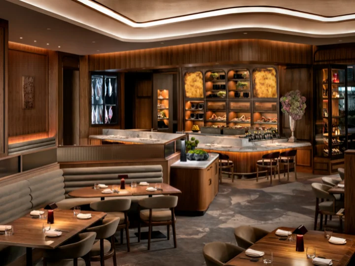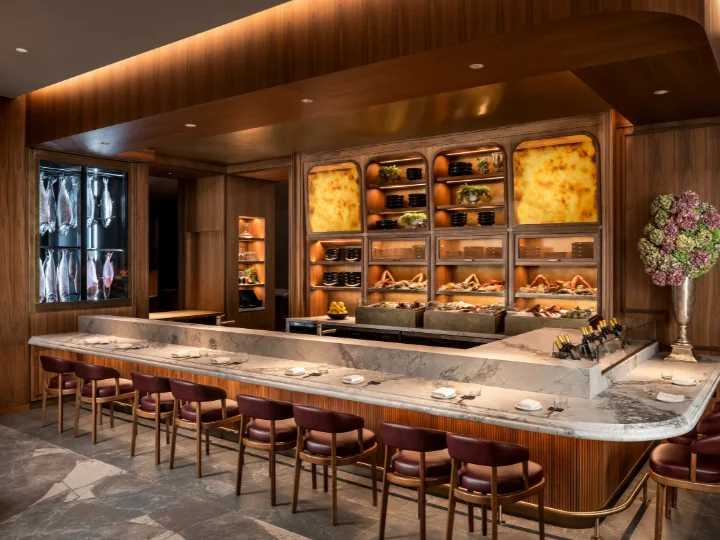 Scene-based controls allow the environment to evolve throughout the day, transitioning from vibrant daytime service to an intimate evening glow. As evening scenes activate, color temperature and intensity gradually deepen to emulate candlelight, enhancing comfort and atmosphere while supporting operational efficiency. Lighting levels, contrast, shadow, and color were meticulously balanced to meet guest comfort and service requirements. Cooler tones enhance the freshness of seafood presentations, while warmer hues enrich meats and wines, reinforcing the artistry of cuisine. Pools of intimacy are layered with evenly illuminated surfaces to ensure seamless service.