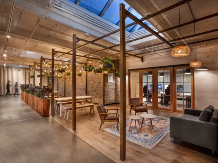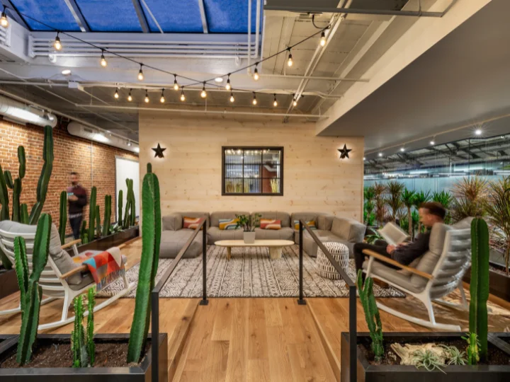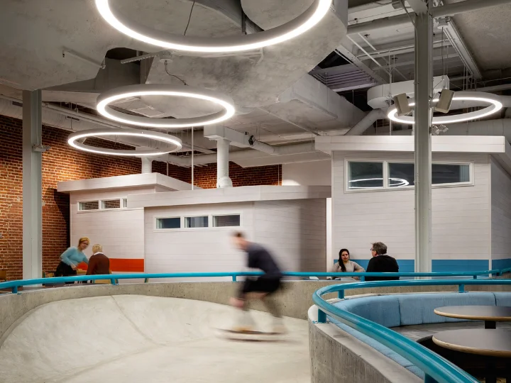 Within one of North America’s largest industrial warehouses, 70,130 square feet were transformed into the headquarters of a technology company. The design team was challenged to think beyond conventional office planning, creating an environment that is cool, collaborative, and unmistakably fun. Signature spaces, including a café, skateboard park, and “the Pit", break from traditional workplace norms in alignment with the company’s vision: think summer camp, not corporate office.