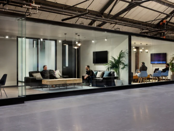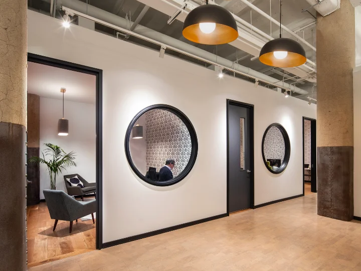 Abundant natural light from existing oversized skylights, high ceilings, and perimeter windows was carefully balanced with artificial lighting. Additional interior glazing was introduced in core meeting spaces to extend daylight penetration. All lighting strategies were designed to comply with IESNA workplace illumination standards.