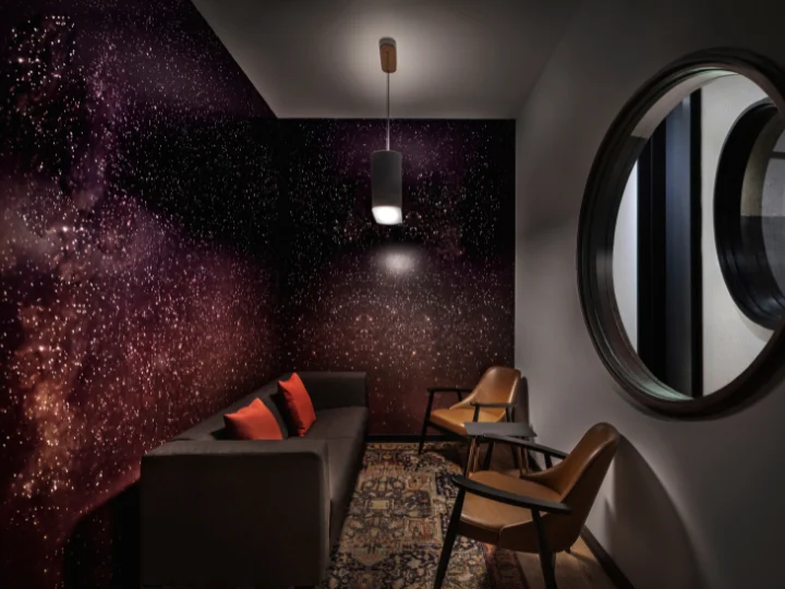 The primary challenge was to celebrate this non-traditional culture while remaining respectful of the building’s heritage industrial architecture. Lighting design played a key role, taking cues from the interior concept that reimagined rooms as a series of experiential “moments,” each with its own mood. Color, form, and abstract compositions were layered as a counterpoint to the machine-like austerity of the existing structure.