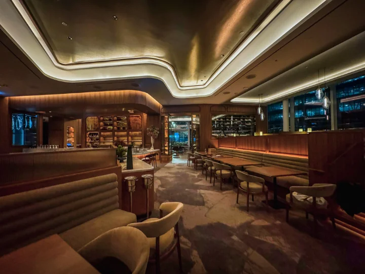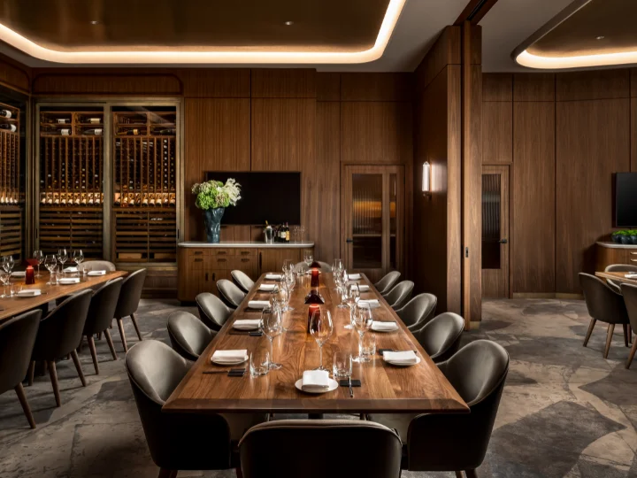 Scene-based controls allow the environment to evolve throughout the day, transitioning from vibrant daytime service to an intimate evening glow. As evening scenes activate, color temperature and intensity gradually deepen to emulate candlelight, enhancing comfort and atmosphere while supporting operational efficiency. Lighting levels, contrast, shadow, and color were meticulously balanced to meet guest comfort and service requirements. Cooler tones enhance the freshness of seafood presentations, while warmer hues enrich meats and wines, reinforcing the artistry of cuisine. Pools of intimacy are layered with evenly illuminated surfaces to ensure seamless service.