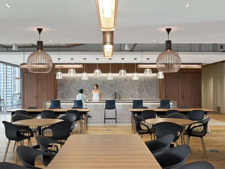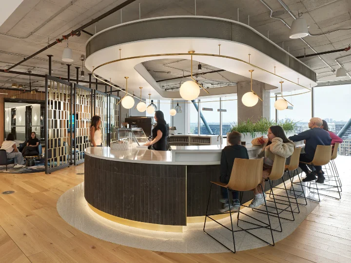 PointClickCare, situated in downtown Toronto, features a strategically designed lighting scheme that balances aesthetics, functionality, and employee well-being. This versatile workplace supports a range of activities, from focused tasks at individual workstations to relaxed interactions in lounges and collaborative discussions in communal spaces and private meeting rooms.
