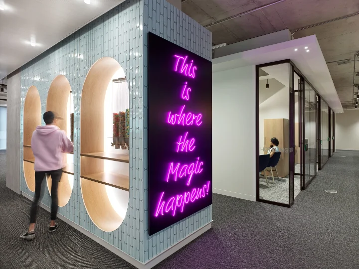 The lighting design was carefully tailored to support a collaborative work environment, enhancing both focus and productivity. The lighting adds character to the space, balancing practicality and aesthetic appeal. While designed for efficiency, the atmosphere moves away from the traditional office feel, incorporating elements that bring warmth and familiarity, similar to a relaxing café than a corporate setting. Unique fixture includes, a fun, brightly lit wall glazer light along the private meeting room hallway that beams “This is where the magic happens”. Meanwhile, ambient lighting establishes the overall mood, minimizing glare and fostering a setting where both teamwork and individual focus can thrive.