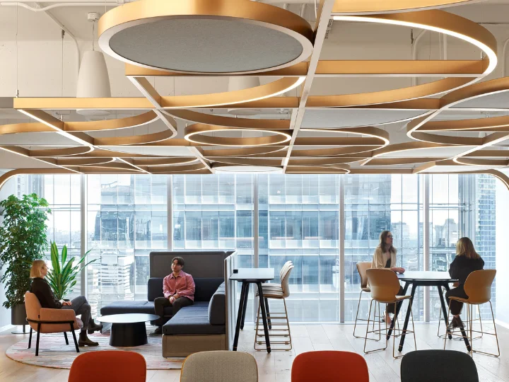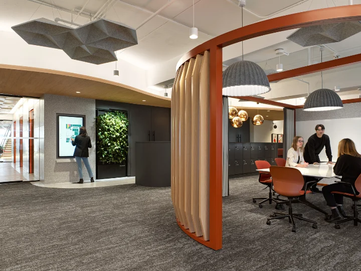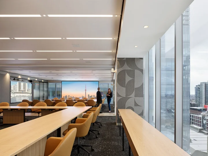 The design replaces private offices with non-assigned seating and adaptable neighbourhoods that encourage movement and spontaneous interaction. A flexible “kit of parts” ensures consistency across Canada while allowing local expression. Acoustic performance, integrated AV, embedded power, and inclusive features, developed in collaboration with accessibility experts, create a workplace that is intuitive, equitable, and highly functional.