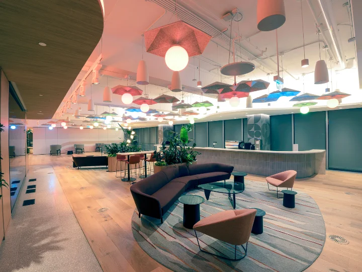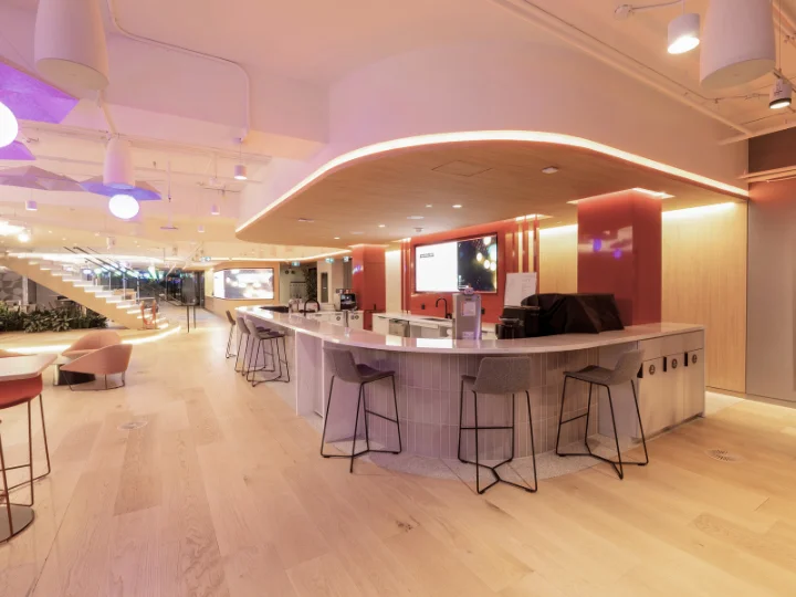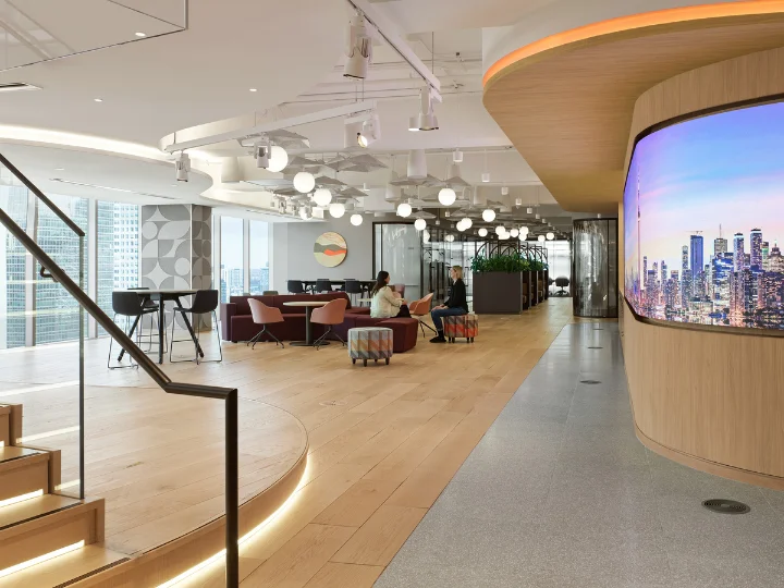 PwC's downtown Toronto office showcases how lighting can redefine the workplace experience. Across 55,000 sq. ft., static white illumination is layered with dynamic colour-changing LEDs and custom fixtures to create an environment that feels both energizing and refined. From floating ceiling effects in reception to softly glowing spherical pendants in communal areas, light shapes mood, supports focus, and allows the office to transition seamlessly from daily tasks to large-scale gatherings and events.